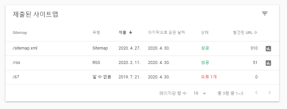 한가지 팁으로 /rss 도 사이트맵 부분에 등록할 수 있습니다. 저는 전에 사이트맵이 없을 때는 rss로 최근 50개를 등록해서 사용 중이었는데요. 지금은 sitemap.xml도 같이 등록해서 구글 서치 콘솔에 인식 시켜주고 있습니다.