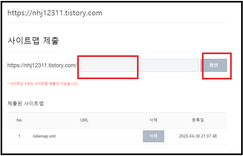 세번째. 사이트맵 제출에 sitemap.xml을 입력하고 '확인'