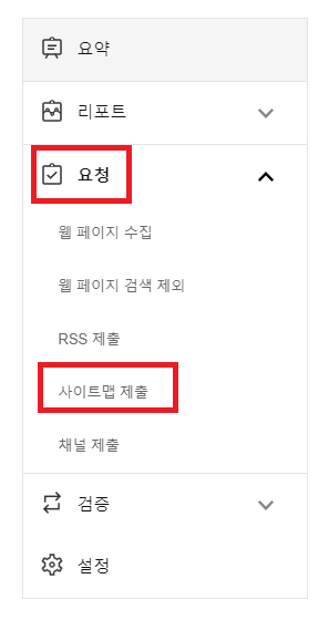 두번째로. 좌측 메뉴에 요청 --> 사이트맵 제출로 들어갑니다.