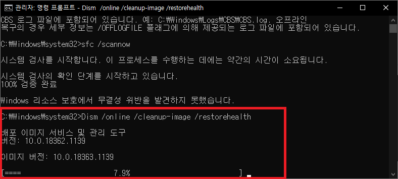 이렇게 뭔가 퍼센테이지가 올라가면서 복구를 하는거 같습니다. 이렇게 윈도우 10 멈춤, 응답없음 증상을 해결하기 위해서는 퍼센테이지가 올라갈때 기도 메타를 이용해서 잠깐 빌어도 봐야될것 같습니다. ㅠ