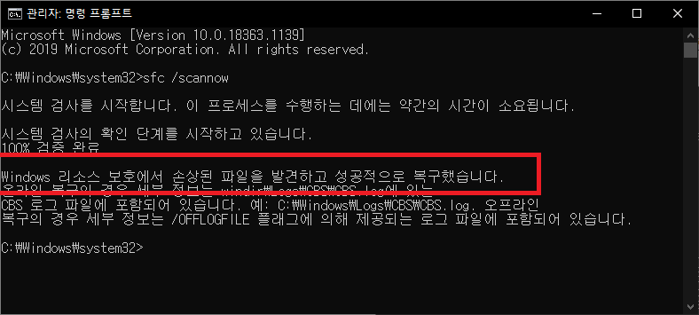 어때요 뭔가 성공적으로 복구 했다고 나왔습니다. 저 같은 경우엔 이걸로 바로 윈도우 10 멈춤, 응답없음 현상이 해결이 되었습니다. 참 좋은 세상입니다. 예전 같았으면 윈도우 포맷하느라 몇시간을 허비 했을 텐데 이제 구글에서 잠깐 검색해서 그대로 해결하면 되는 세상이라니