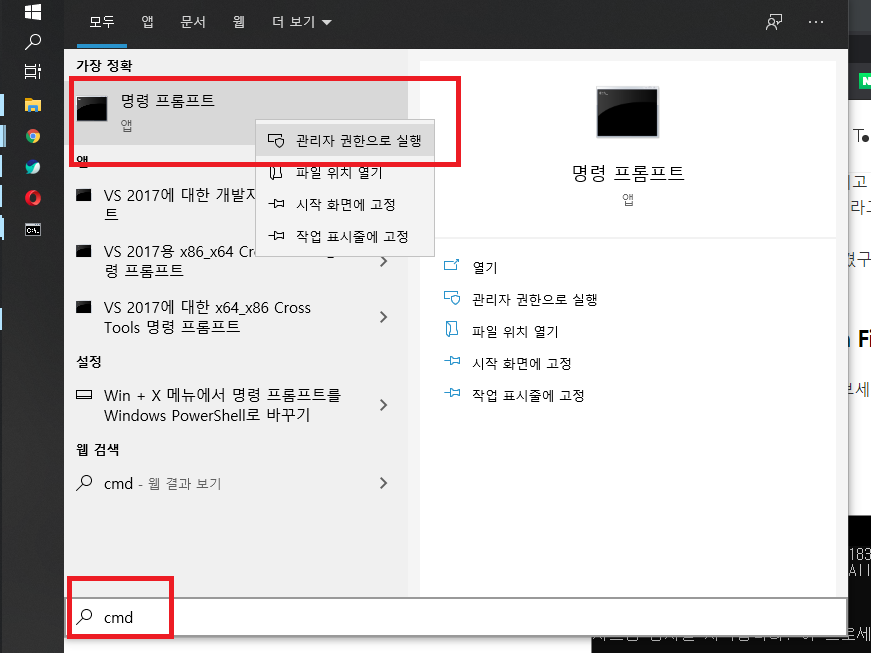 먼저 시작 버튼을 누르고 cmd를 입력해보세요. 그러면 '명령 프롬프트'가 검색 될텐데요. 마우스 우클릭 하셔서 '관리자 권한으로 실행'을 선택해주세요.