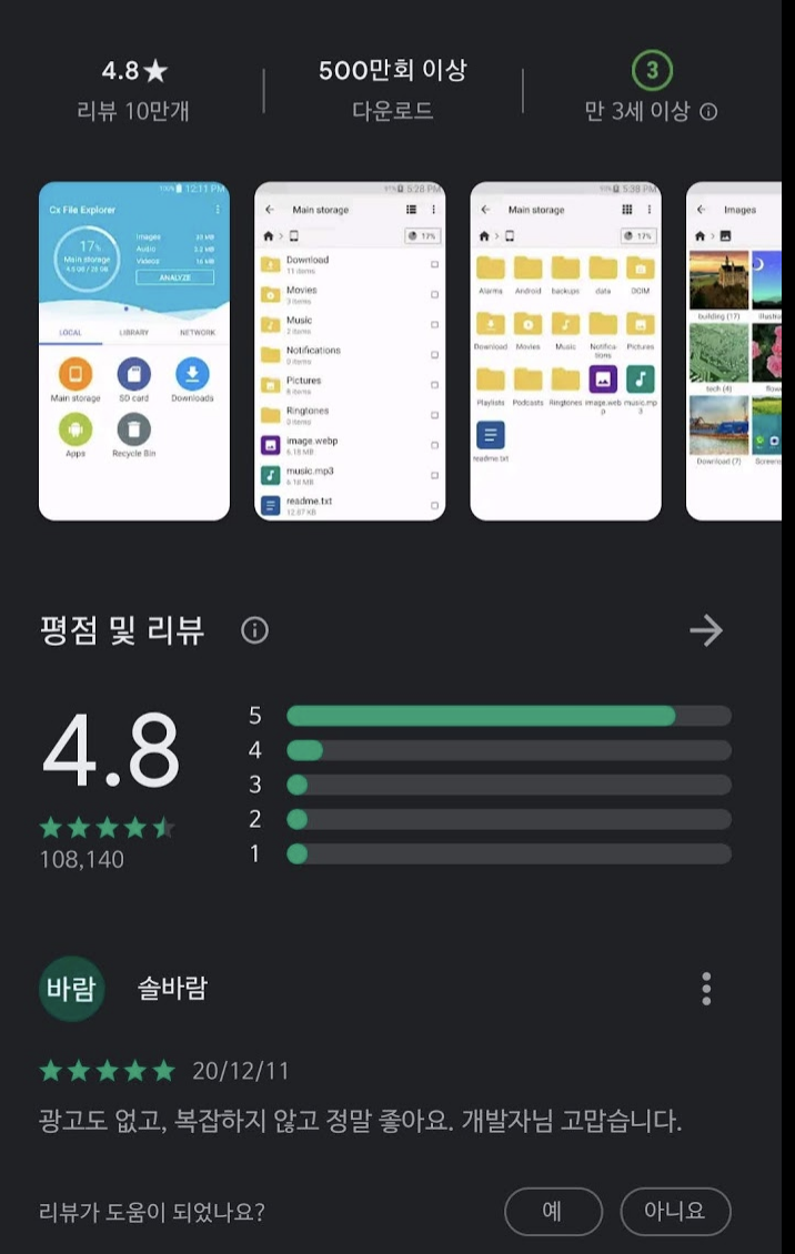 이 APK 파일 추출 기능 외에도 광고도 없고 강력한 기능들이 많은 CK 파일 탐색기를 설치해주시면 되는데요. 평점 4.8에 1,000만 회 이상 다운로드에 빛나는 아주 강력한 어플입니다. 평소에 어플을 설치하실 때에는 항상 평점과 다운로드 수를 유심히 봐주시는 것이 좋습니다.