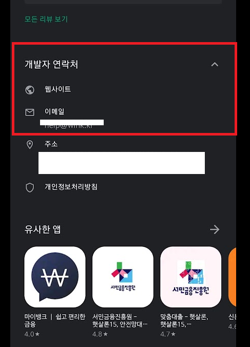 구글 스토어에서 앱 검색하여 들어가신 뒤에 하단 부분으로 스크롤 내리다 보면 '개발자 연락처' 부분을 발견하실수 있습니다.