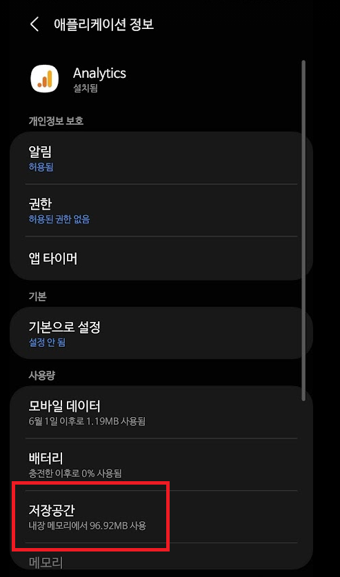 저장공간으로 들어가야 앱 캐시나 앱 데이터를 삭제할 수 있어요.