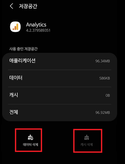 군말 없이 앱 데이터 삭제와 앱 캐시 삭제를 눌러 줍니다. 그리고 앱을 다시 켜서 증상을 확인해봅니다.