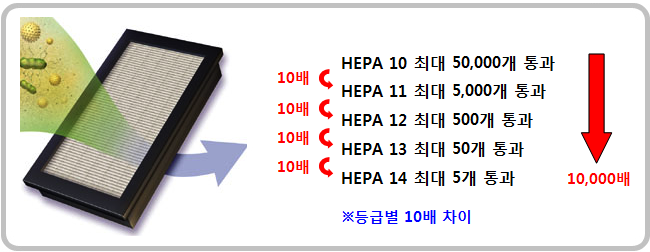 헤파 필터 등급에는 H10, H11, H12, H13, H14, E10, E11, E12, U15, U16, U17가 있는데요.