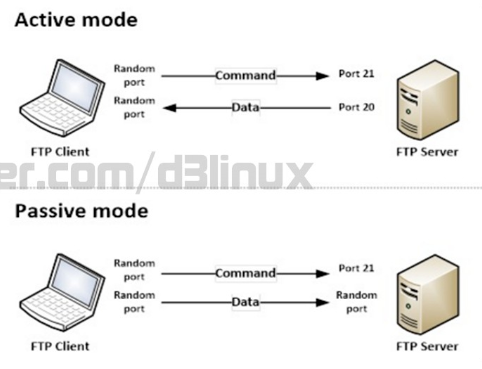 FTP는 명령어를 전달하는 21 포트와 데이터를 전달하는 20(혹은 랜덤) 포트가 있다고 기억하면 되겠습니다. 데이터를 전달하는 방식에 따라 액티브와 패시브 모드가 있는데. 좋은 그림이 있어 가져왔습니다.