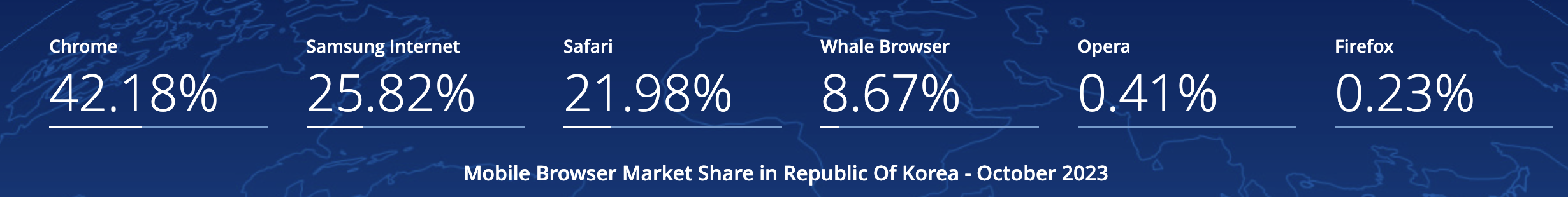 크롬(42%) > 삼성 인터넷(25.82%) > 사파리(21.98%) > 웨일(8.67%) > 오페라(0.4%)